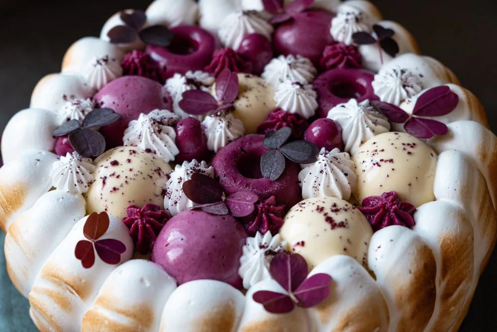 Nu har du alla bottnar klara och de tre fyllningarna frysta för sig. Ta ut alla fyllningar ut frysen och tar bort plasten runt dem. Lägg en botten på en tårtpapp, lägg lagret med svarta vinbärsbavaroise ovanpå. Lägg på en till botten, lägg lagret med svarta vinbärscurd på, avsluta med sista bottnen och lagret med rosmarinsbavaroisen överst. Ta ut alla små silikonformar med dekorationer ur frysen. Pluppa ur dem och fördela över toppen på tårtan, spara ca 1,5 - 2 cm runt om för marängen. Använd lite av marängen för att fylla ut kanterna runtom tårtan. Spritsa sedan strängar uppifrån och ned längs med tårtans kant. Här är det lättast om du satt tårtan på något som är lite mindre än tårtan själv så att du kan komma åt undertill och trimma bort maräng som hänger ner och snygga till avslutet nertill. Bränn av marängen lätt med en brännare och dekorera med oxalisblad. Låt tårtan stå några timmar i kylen innan servering så att den hinner tina.